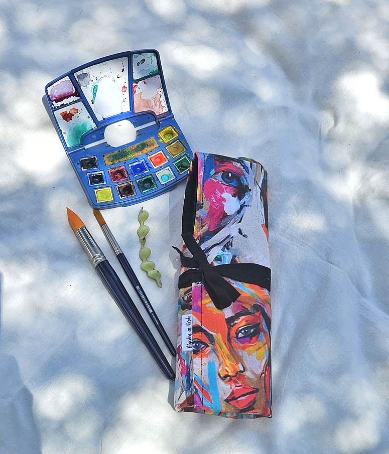 Porta-Pinceles para artistas, en tejido de algodón ecológico. Perfecto para tener ordenados tus pinceles, para salir a pintar fuera o llevártelos de viaje.